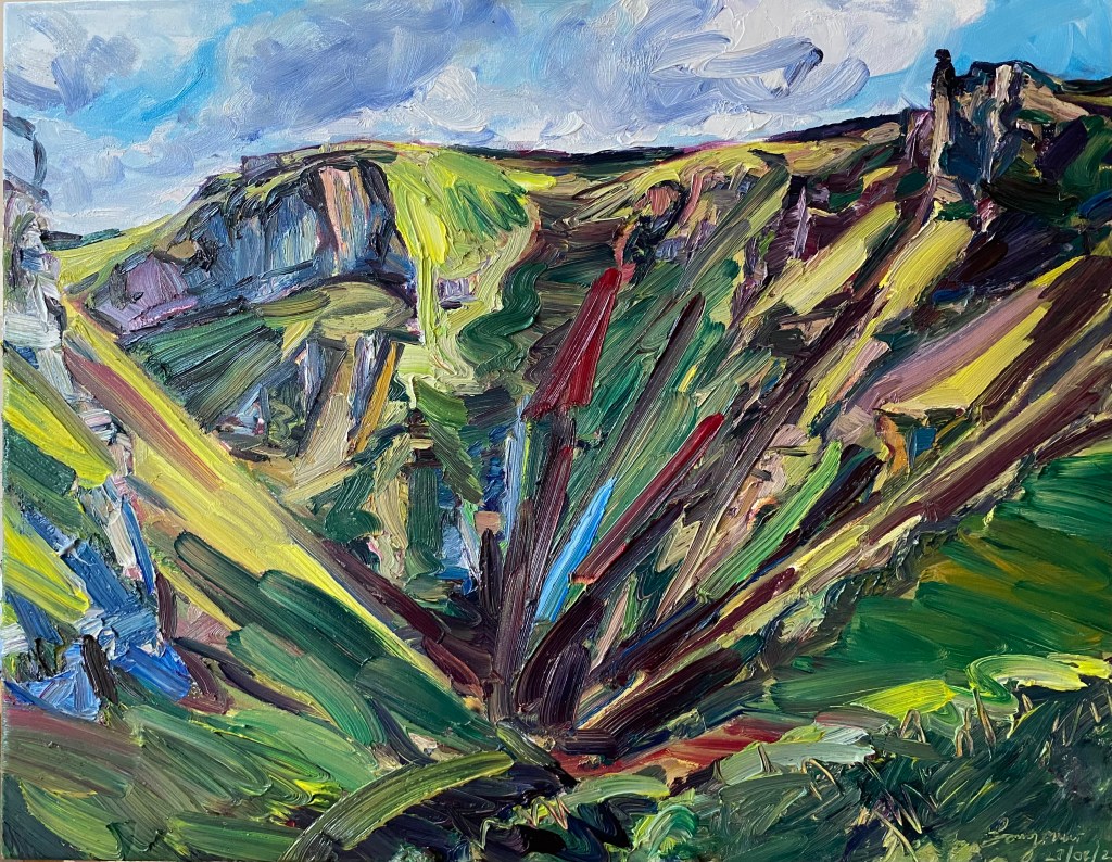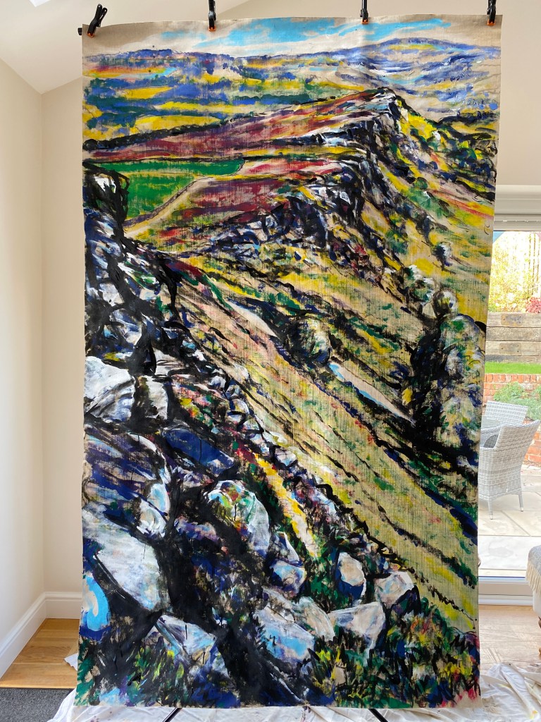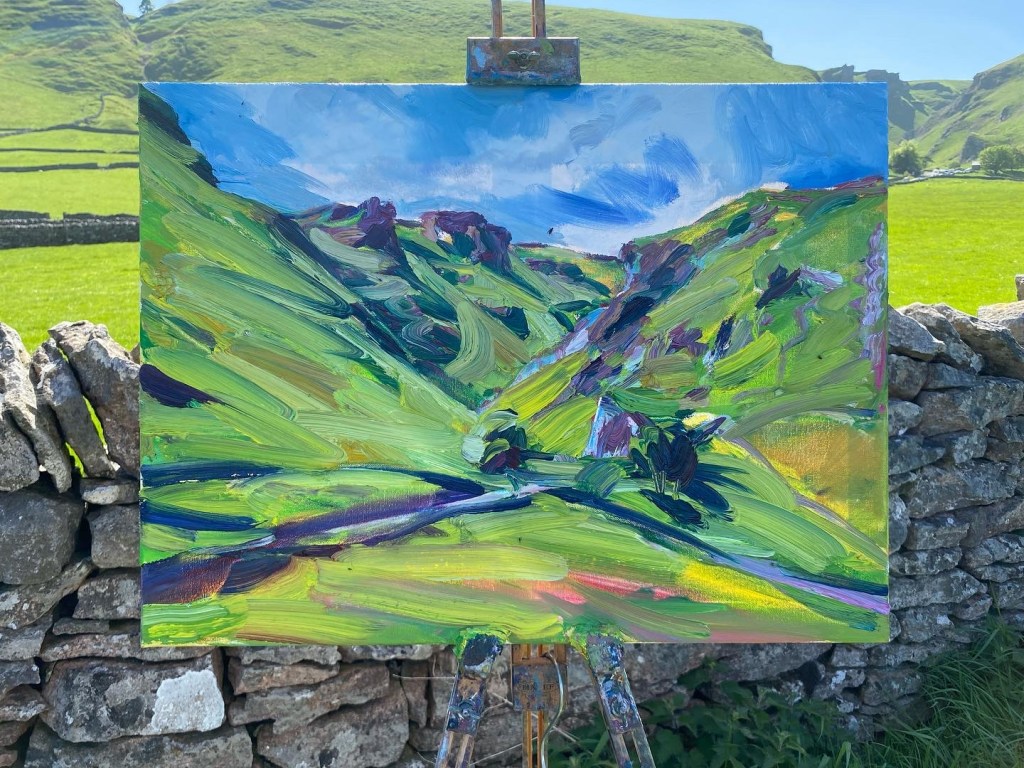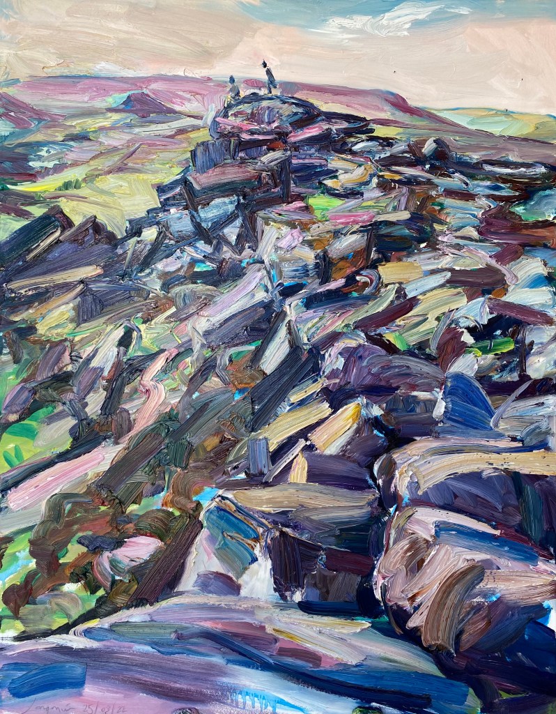 ‘Higger Tor’, oil on canvas, 91cm x 71cm. 22/01/2022. Private collection.‘Higger Tor’, oil on canvas, 90cm x 70cm. 22/02/2022. Free delivery in the Sheffield area. ‘Winnats Pass’, oil on canvas, 90cm x 70cm. 27/02/2022. Spent a beautiful day in this dramatic location. Private collection.‘Stanage from Trig Point’, oil on canvas, 71cm x 91cm. 25/03/2022. Free delivery in the Sheffield area. ‘Large Stanage from Trig Point’, oil on canvas, 914mm x 1210mm. 20/04/2022. Private collection.‘Peveril Castle from Cave Dale’, oil on canvas, 91cm x 71cm, 21/04/2022. Private collection.‘Beautiful day at Winnats Pass’. Oil on canvas, 61cm x 45cm 24/05/2022. Private collection.‘Upper Padley Gorge’, oil on canvas, 50cm x 120cm. 01/07/2022. Private collection. ‘Lumsdale Falls, Matlock’, oil on canvas, 30cm x 76cm, 19/07/2022. Free delivery in the Sheffield area. ‘Winnats Pass’, oil on canvas, 41cm x 31cm, 24/08/2022. Free delivery in the Sheffield area. ‘Mam Tor and the Great Ridge’, oil on canvas, 30cm x 76cm. 30/08/2022. Private collection‘Curbar and Baslow Edge’, ink and acrylic paint on linen, 250cm x 350cm. 01/09/2022‘Carsington’, oil on canvas, 61cm x 76cm, 11/09/2022. Free delivery in the Sheffield area. ‘Ladybower Reservoir’, oil on canvas, 71cm x 91cm, 25/102022. Free delivery in the Sheffield area. ‘River Derwent from Beeley Bridge’, oil on canvas, 50cm x 70cm, 10/12/2022. Free delivery in the Sheffield area. ‘Curbar Edge in Wild Winds’, oil on canvas, 59cm x 42cm, 04/01/2023‘People enjoying Stanage’, oil on canvas, 70cm x 90cm, 06/01/2023‘Burbage Brook’, oil on canvas, 30cm x 76cm, 18/02/2023 Private collection.‘Cave Dale’, gouache on Arches hot pressed watercolour paper, 30cm x 42cm, 21/02/2023‘Two Sheep in front of Mam Tor’, gouache on Hahnemuhle 450gsm paper, 20cm x 50cm, 21/02/2023