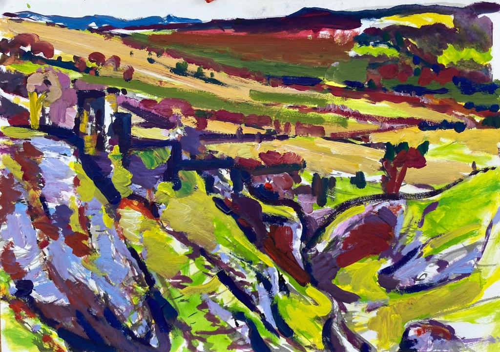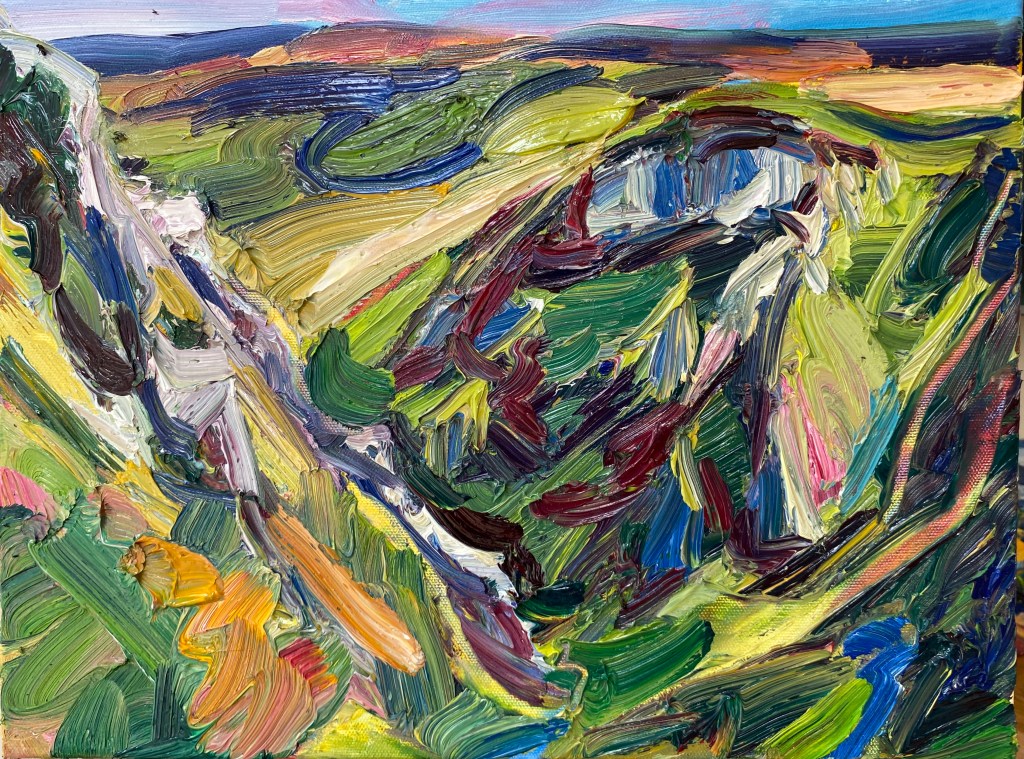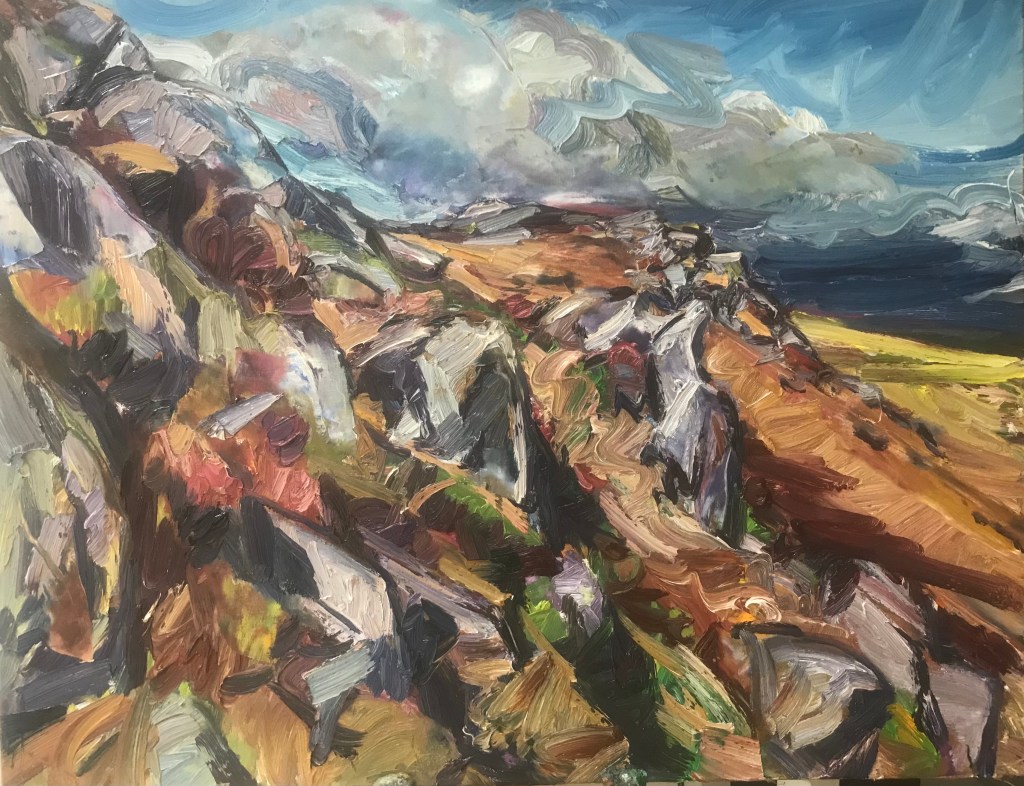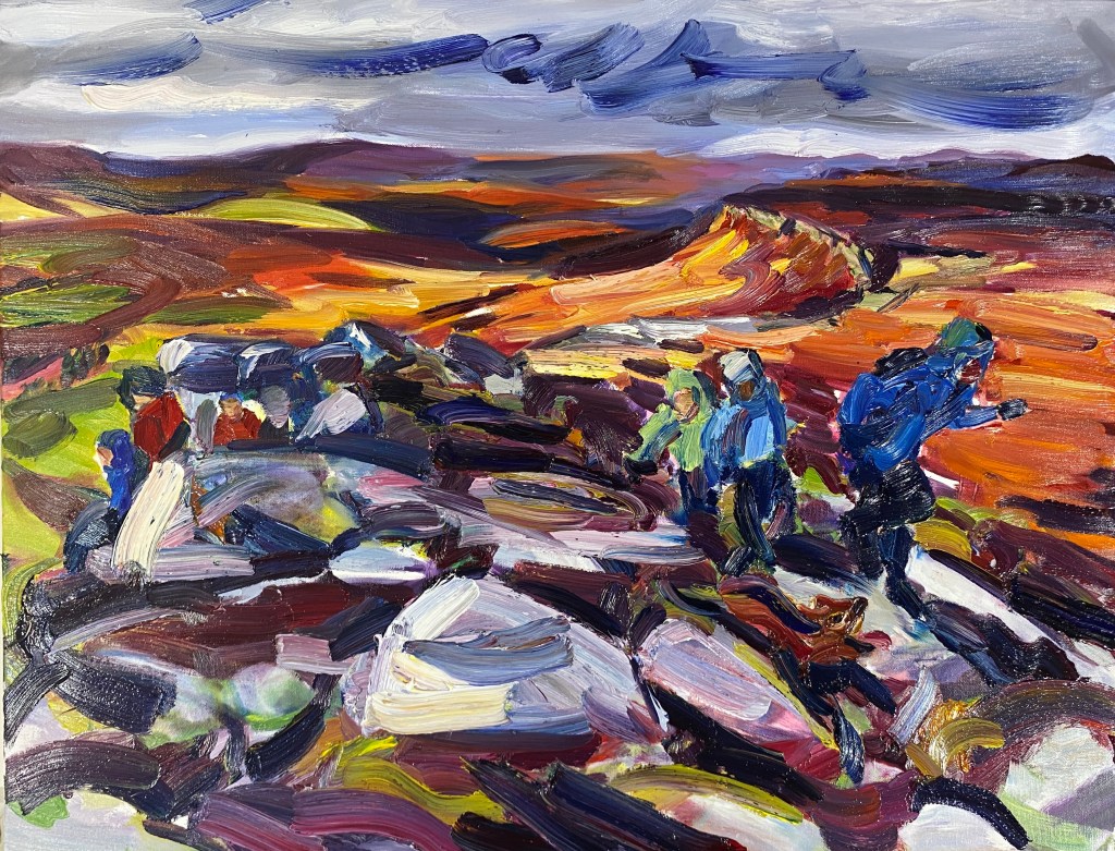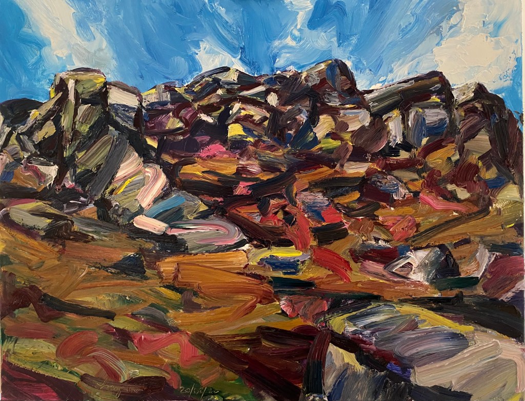 ‘Higger Tor’, oil on canvas, 91cm x 71cm. 22/01/2022. Private collection.‘Higger Tor’, oil on canvas, 90cm x 70cm. 22/02/2022. Free delivery in the Sheffield area. ‘Winnats Pass’, oil on canvas, 90cm x 70cm. 27/02/2022. Spent a beautiful day in this dramatic location. Private collection.‘Stanage from Trig Point’, oil on canvas, 71cm x 91cm. 25/03/2022. Free delivery in the Sheffield area. ‘Large Stanage from Trig Point’, oil on canvas, 914mm x 1210mm. 20/04/2022. Private collection.‘Peveril Castle from Cave Dale’, oil on canvas, 91cm x 71cm, 21/04/2022. Private collection.‘Beautiful day at Winnats Pass’. Oil on canvas, 61cm x 45cm 24/05/2022. Private collection.‘Upper Padley Gorge’, oil on canvas, 50cm x 120cm. 01/07/2022. Private collection. ‘Lumsdale Falls, Matlock’, oil on canvas, 30cm x 76cm, 19/07/2022. Free delivery in the Sheffield area. ‘Winnats Pass’, oil on canvas, 41cm x 31cm, 24/08/2022. Free delivery in the Sheffield area. ‘Mam Tor and the Great Ridge’, oil on canvas, 30cm x 76cm. 30/08/2022. Private collection‘Curbar and Baslow Edge’, ink and acrylic paint on linen, 250cm x 350cm. 01/09/2022‘Carsington’, oil on canvas, 61cm x 76cm, 11/09/2022. Free delivery in the Sheffield area. ‘Ladybower Reservoir’, oil on canvas, 71cm x 91cm, 25/102022. Free delivery in the Sheffield area. ‘River Derwent from Beeley Bridge’, oil on canvas, 50cm x 70cm, 10/12/2022. Free delivery in the Sheffield area. ‘Curbar Edge in Wild Winds’, oil on canvas, 59cm x 42cm, 04/01/2023‘People enjoying Stanage’, oil on canvas, 70cm x 90cm, 06/01/2023‘Burbage Brook’, oil on canvas, 30cm x 76cm, 18/02/2023 Private collection.‘Cave Dale’, gouache on Arches hot pressed watercolour paper, 30cm x 42cm, 21/02/2023‘Two Sheep in front of Mam Tor’, gouache on Hahnemuhle 450gsm paper, 20cm x 50cm, 21/02/2023