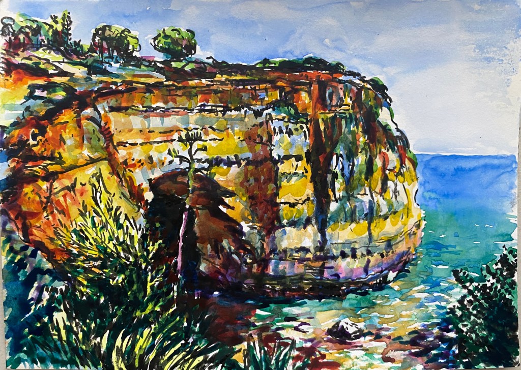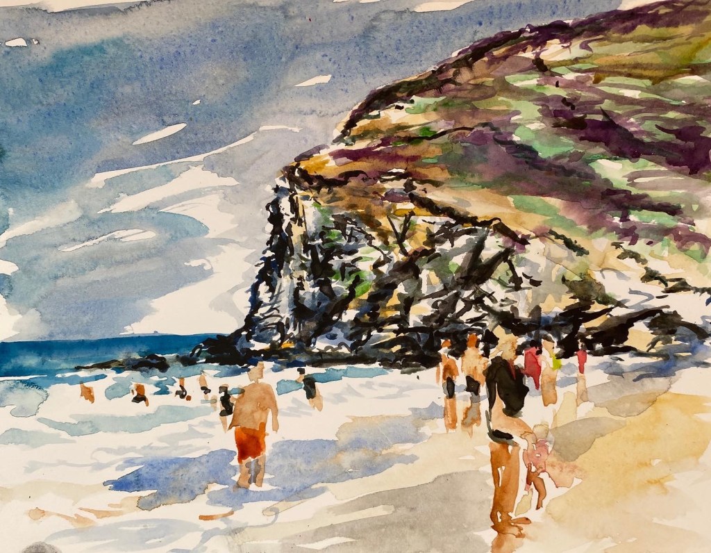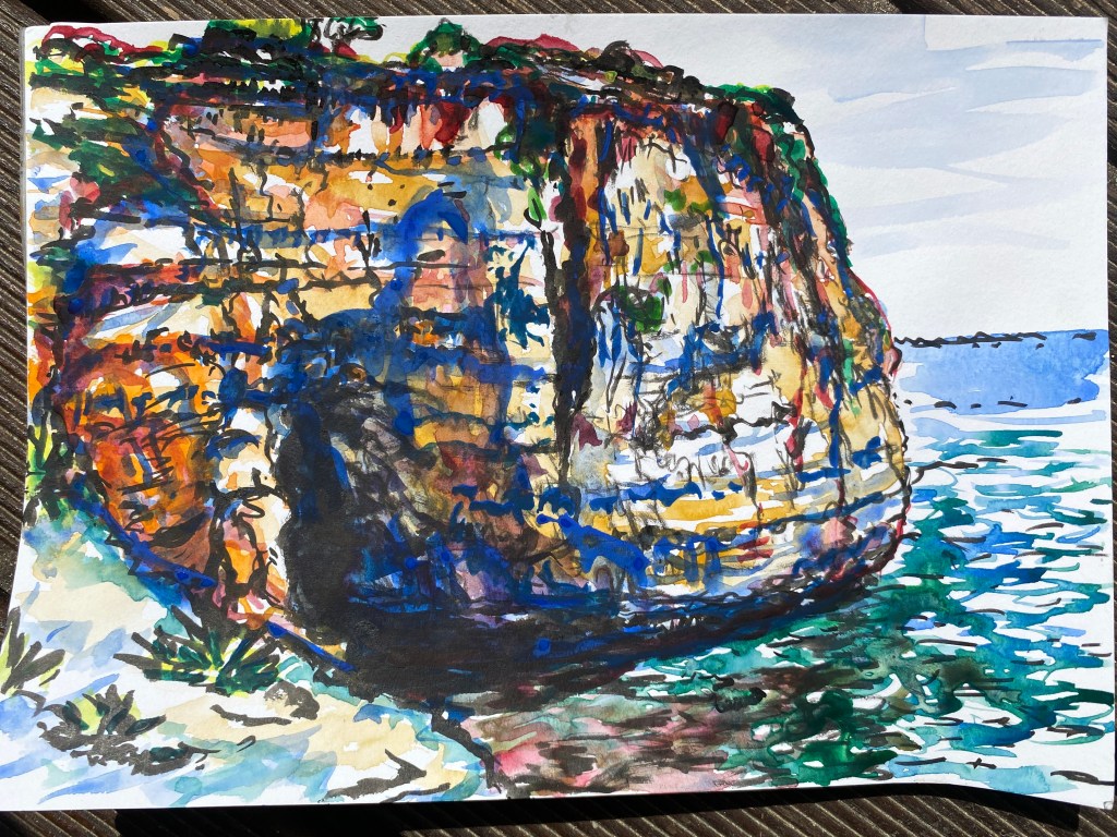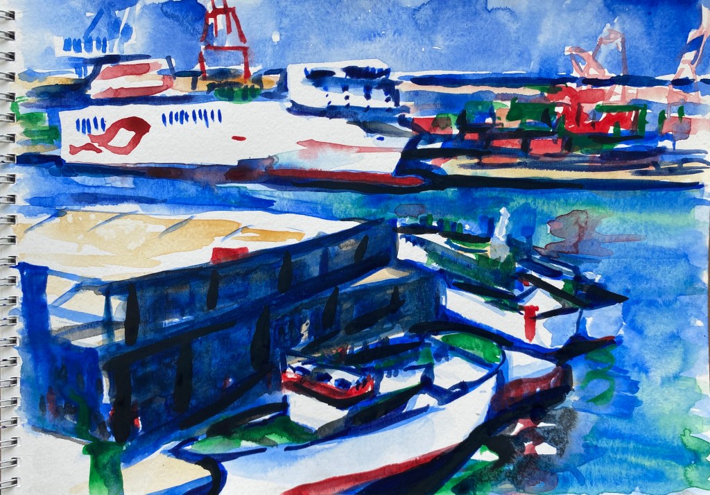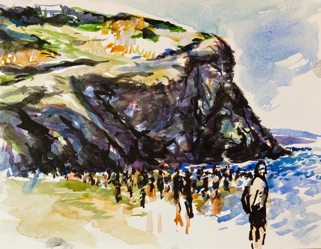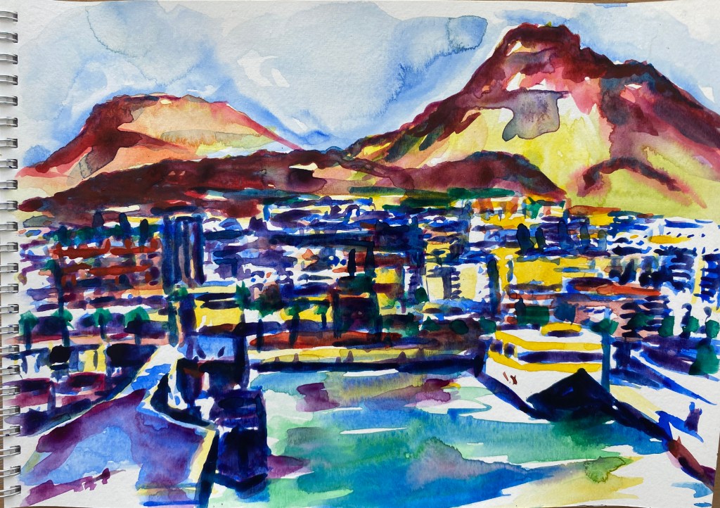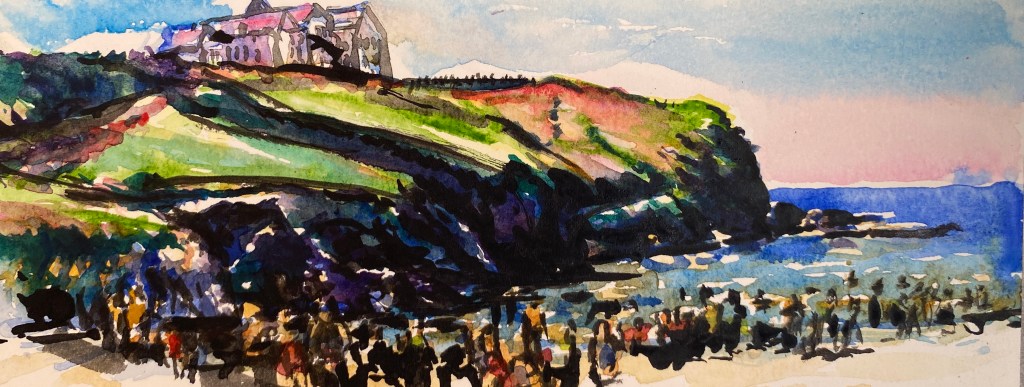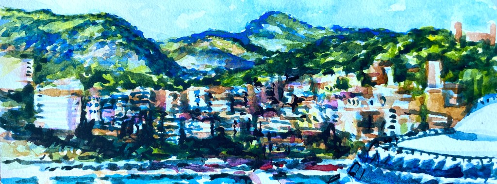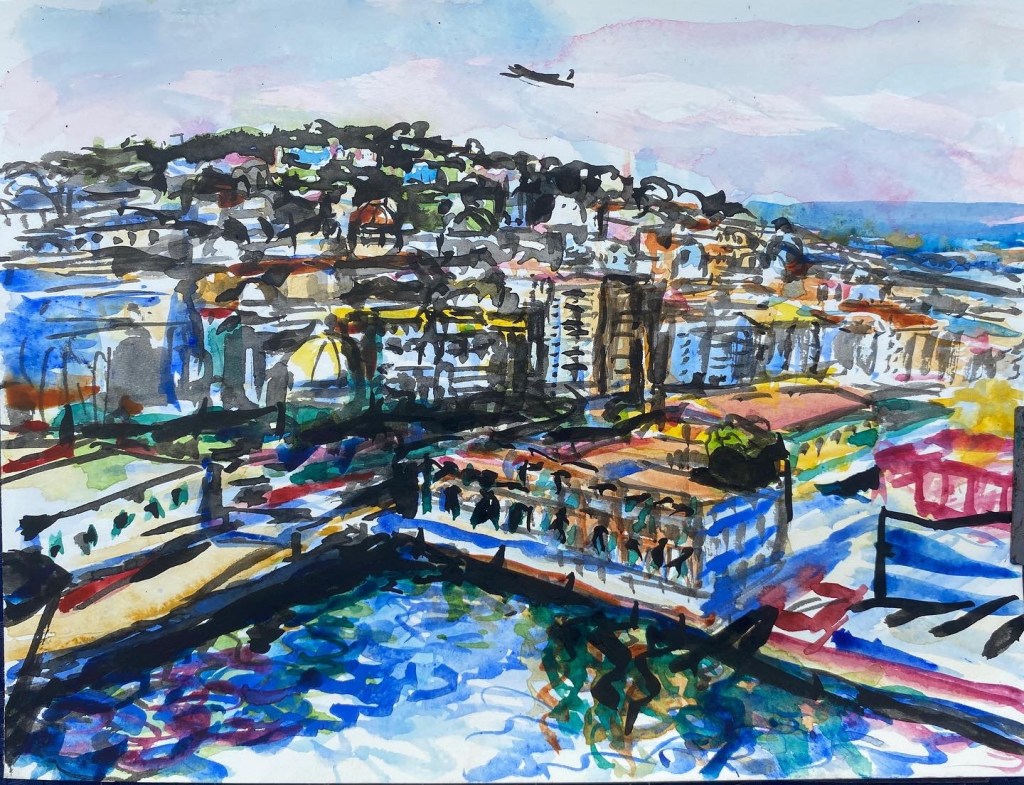 ‘Window from the Old Schoolhouse’, watercolour and ink on Arches watercolour paper, 21cm x 30cm, 07/08/2022. Private collection.‘Open Patio Doors on the Garden’, watercolour and ink on Arches watercolour paper, 21cm x 30cm, 08/08/2022. Private collection.‘Perranporth Bay’, watercolour and ink on 300gsm Arches watercolour paper, 23cm x 31cm. 09/08/2022. Private collection. ‘Perranporth Bay’, watercolour and ink on 300gsm Arches watercolour paper, 23cm x 31cm. 09/08/2022.‘Poldhu Cove’, watercolour and ink on 300gsm Arches watercolour paper, 10cm x 25cm, 10/08/2022. ‘Poldhu Cove’, watercolour and ink on 300gsm Arches watercolour paper, 10cm x 25cm, 10/08/2022. ‘Perranporth Beach Crowd, ‘ watercolour and ink on 300gsm Arches watercolour paper, 10cm x 25cm, 13/08/2022‘Napoli from the Norwegian Epic’, watercolour and ink on 300gsm Arches watercolour paper, 23cm x 31cm. 17/08/2022‘Palma Cathedral from the Norwegian Epic’, watercolour and ink on 300gsm Arches watercolour paper, 10cm x 25cm, 20/08/2022‘Residential Palma from the Norwegian Epic’, watercolour and ink on 300gsm Arches watercolour paper, 10cm x 25cm, 20/08/2022‘Ajaccio from the Norwegian Epic’, watercolour and ink on 300gsm Arches watercolour paper, 21cm x 30cm, 22/08/2022‘Funchal, Madeira from the Marella’, watercolour on 250gsm sketchbook paper. 21cm x 60cm, 06/04/3023‘Unusual Pose seen through the Legs’, gouache on 250gsm sketchbook paper, 21cm x 30cm, 09/04/2023‘Las Palmas Harbour, Gran Canaria’, watercolour on 250gsm sketch pad paper, 30cm x 21cm, 10/04/2023‘The Port at Las Palmas, Gran Canaria’, watercolour on 250gsm sketchbook paper, 21cm x 30cm, 10/04/2023‘Tivoli, Carvoeiro’ ink and watercolour on 220gsm cartridge, A4. 12/08/23‘Tivoli, Carvoeiro’ ink and pencil crayon on Hahnemuhle Sumi-e rice paper, A4. 12/08/23. ‘Tivoli, Carvoeiro’, ink and watercolour on 220gsm cartridge paper, 30cm x 21cm, 13/08/23‘Praia Fluvial de Ortigal em Arganil’, gouache on canvas, 45cm x 60cm. 18/08/23
