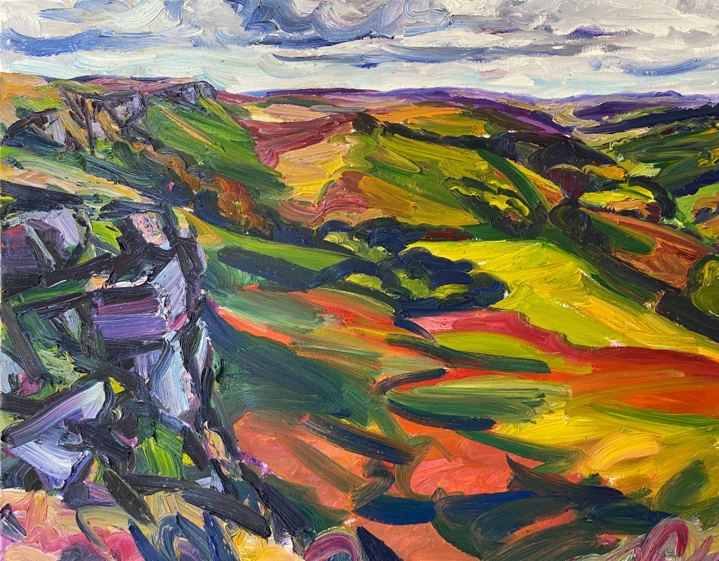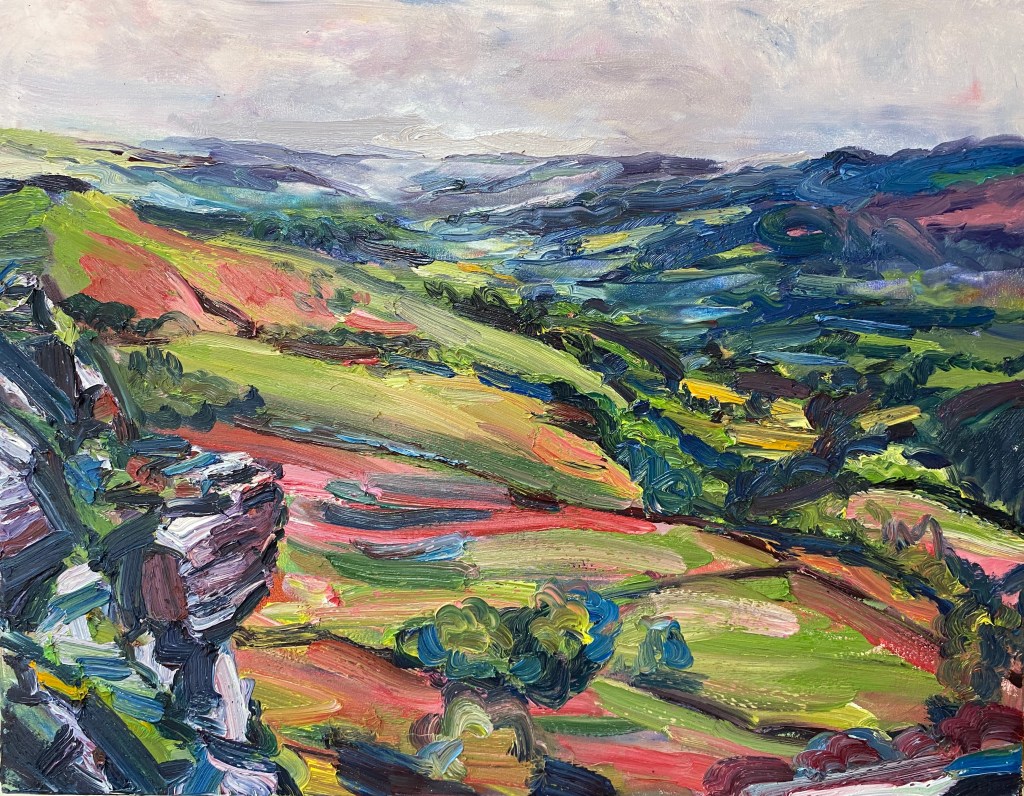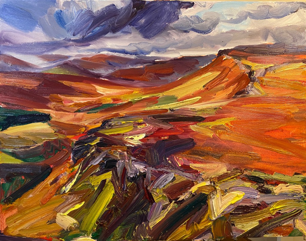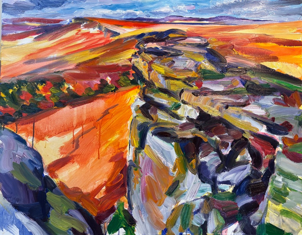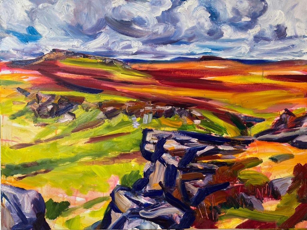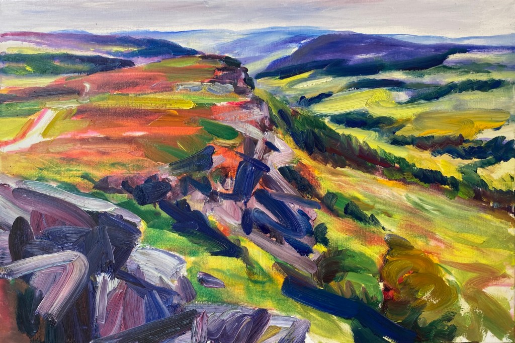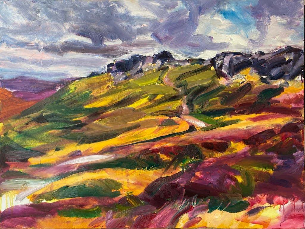 ‘Winnats Pass towards Hope Valley’, oil on Loxley Mayfair canvas, 100cm x 76cm, 28/11/24. Private collection ‘Monsal Head after Snow’, oil on Loxley Mayfair canvas, 100cm x 76cm, 21/11/24. ‘Stanage Edge from Balcony Cave’, oil on Loxley Mayfair canvas, 90cm x 70, 14/11/24.‘Curbar Village from The Edge’, oil on canvas, 70cm x 90cm, 25/10/24 ‘Chatsworth framed with Autumn Leaves’, oil on canvas, 62cm x 91cm. 17/10/24‘Stanage from Black Hawk Bay’ oil on canvas, 91cm x 61cm. 10/10/24‘Millstones, Stanage’, oil on canvas, 101cm x 76cm, 28/09/2024. Private collection, New York.‘Millstones, Stanage Edge’, oil on canvas, 101cm x 76cm, 19/09/2024. Private collection‘Heather before Stanage Edge’, oil on canvas, 100cm x 76cm. 21/08/2024 Private collection. ‘Calver from Curbar Edge’, oil on canvas, 90cm x 70cm, 09/08/2024 Private collection. ‘Hope Valley from Bamford Edge’, oil on canvas, 70cm x 90cm, 23/02/2023 Private collection.‘Stanage Edge from Upper Burbage’, oil on canvas, 100cm x 76cm. 8/7/24. Private collection‘Curbar Edge’, oil on canvas, 70cm x 90cm, 15/04/2023 Private collection‘Baslow Edge from Curbar Edge, oil on canvas, 90cm x 60cm. 1/7/24 Private collection‘Chatsworth and the Derwent’, oil on canvas, 70cm x 90cm. 19/05/2023.‘Hope Valley from Stanage’, oil on canvas, 70cm x 90cm. 31/05/2023 private collection.‘Potting Shed at Hopton Hall’, oil on canvas, 80cm x 60cm. 01/07/2023. Private collection.‘Towards Hathersage from Stanage’. Oil on canvas, 70cm x 90cm. Private collection.‘Hope Valley from Stanage’, oil on canvas, 70cm x 90cm. 29/08/2023. Private collection.‘Slippery Stones, Padley Gorge’ oil on quadruple gesso primed Loxley Mayfair canvas. 50cm x 100cm, 11!09/2023‘Winnats Pass’, oil on canvas, 81cm x 61cm, 25/09/2023.‘Walkers on Stanage’, ink and acrylic on Canson watercolour paper. 150cm x 250cm. 02/10/2023‘Towards Hathersage from Stanage’, oil on canvas, 81cm x 61cm, 09/10/23 private collection‘Edale’, oil on canvas, 100cm x 40cm, 16/10/23 private collection‘Stanage Edge’, oil on canvas, 91cm x 71cm. 6/11/23 Private collection‘Stanage towards Hope Valley’, oil on canvas, 71cm x 91cm. 20/11/23. Private collection. ‘Monsal Head’, oil on canvas, 91cm x 71cm, 11/12/23 Private collection‘Monsal Head No.3’, oil on canvas, 71cm x 91cm, 19/02/24. Private collection. ‘Ladybower Reservoir from Bamford Edge’, 71cm x 91cm, 01/03/24 Private collection‘Winnats Pass’, oil on canvas, 71cm x 91cm, 4/3/24‘Bridge into Bakewell’, oil on canvas, 71cm x 91cm. 18/03/24.‘Baslow Edge from Curbar’, oil on canvas, 120cm x 30cm. 29/04/24 Private collection ‘Edale and Kinder’, oil on canvas, 100cm x 76cm. 13/05/2024‘Hope Valley from Stanage’, oil on canvas, 90cm x 70cm. 03/06/2024.‘From Stanage towards Mam Tor’ oil paint on canvas, 90cm x 70cm, 24/06/24. Private collection.