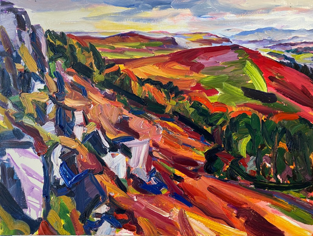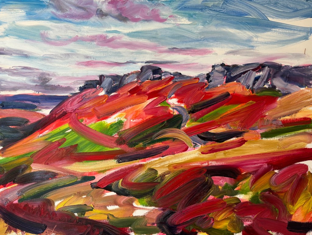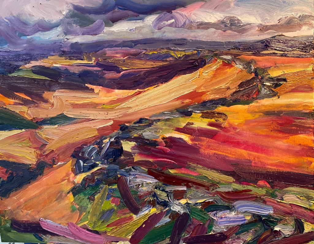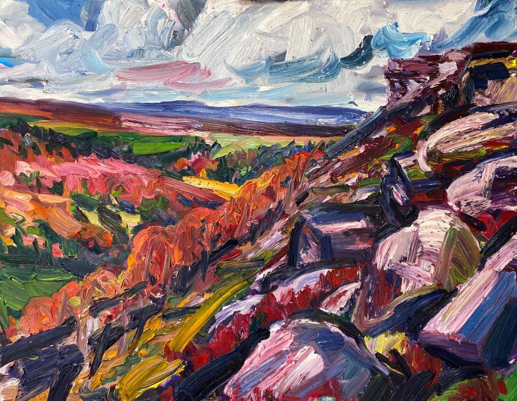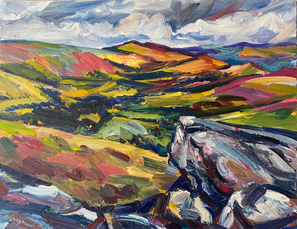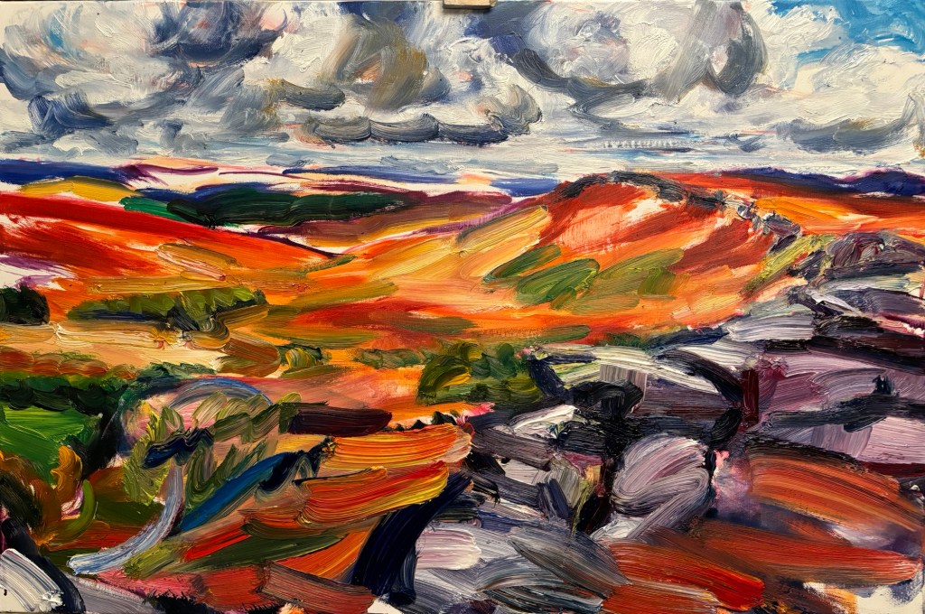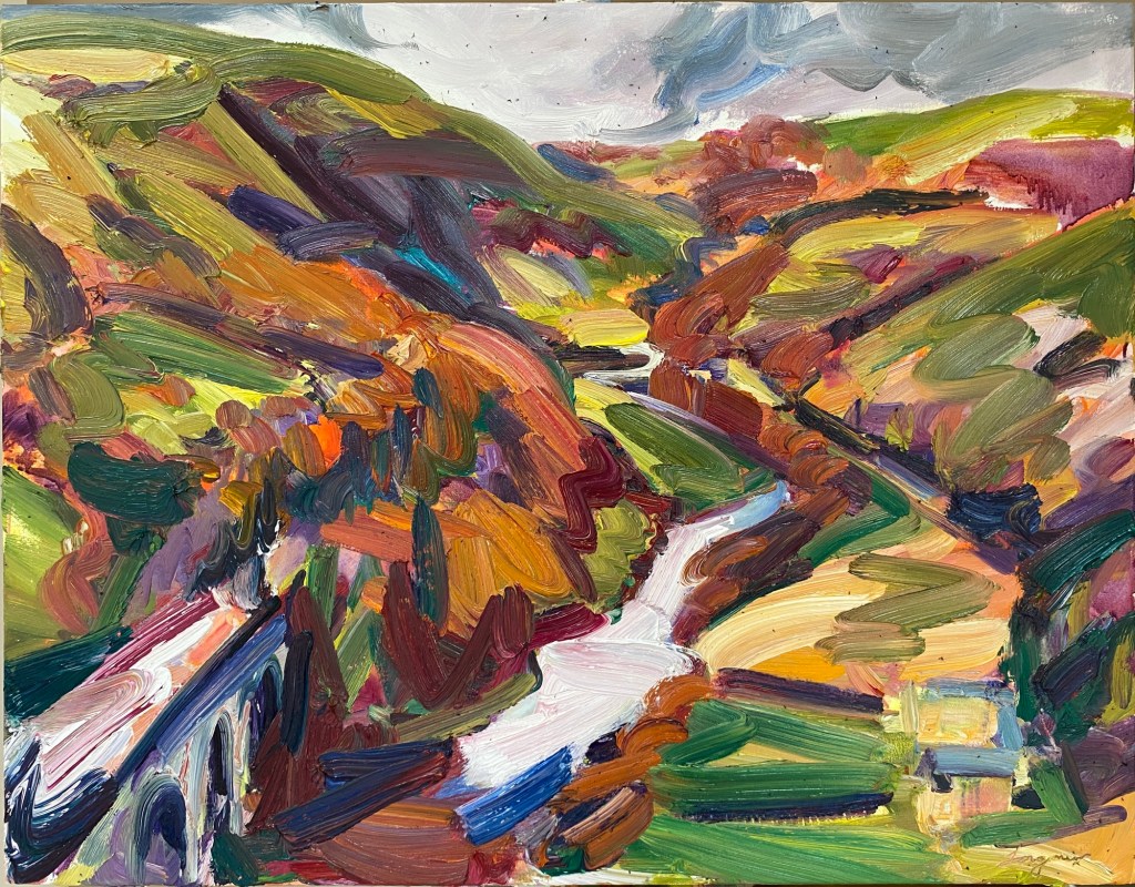 ‘Winnats Pass towards Hope Valley’, oil on Loxley Mayfair canvas, 100cm x 76cm, 28/11/24. Private collection ‘Monsal Head after Snow’, oil on Loxley Mayfair canvas, 100cm x 76cm, 21/11/24. ‘Stanage Edge from Balcony Cave’, oil on Loxley Mayfair canvas, 90cm x 70, 14/11/24.‘Curbar Village from The Edge’, oil on canvas, 70cm x 90cm, 25/10/24 ‘Chatsworth framed with Autumn Leaves’, oil on canvas, 62cm x 91cm. 17/10/24‘Stanage from Black Hawk Bay’ oil on canvas, 91cm x 61cm. 10/10/24‘Millstones, Stanage’, oil on canvas, 101cm x 76cm, 28/09/2024. Private collection, New York.‘Millstones, Stanage Edge’, oil on canvas, 101cm x 76cm, 19/09/2024. Private collection‘Heather before Stanage Edge’, oil on canvas, 100cm x 76cm. 21/08/2024 Private collection. ‘Calver from Curbar Edge’, oil on canvas, 90cm x 70cm, 09/08/2024 Private collection. ‘Hope Valley from Bamford Edge’, oil on canvas, 70cm x 90cm, 23/02/2023 Private collection.‘Stanage Edge from Upper Burbage’, oil on canvas, 100cm x 76cm. 8/7/24. Private collection‘Curbar Edge’, oil on canvas, 70cm x 90cm, 15/04/2023 Private collection‘Baslow Edge from Curbar Edge, oil on canvas, 90cm x 60cm. 1/7/24 Private collection‘Chatsworth and the Derwent’, oil on canvas, 70cm x 90cm. 19/05/2023.‘Hope Valley from Stanage’, oil on canvas, 70cm x 90cm. 31/05/2023 private collection.‘Potting Shed at Hopton Hall’, oil on canvas, 80cm x 60cm. 01/07/2023. Private collection.‘Towards Hathersage from Stanage’. Oil on canvas, 70cm x 90cm. Private collection.‘Hope Valley from Stanage’, oil on canvas, 70cm x 90cm. 29/08/2023. Private collection.‘Slippery Stones, Padley Gorge’ oil on quadruple gesso primed Loxley Mayfair canvas. 50cm x 100cm, 11!09/2023‘Winnats Pass’, oil on canvas, 81cm x 61cm, 25/09/2023.‘Walkers on Stanage’, ink and acrylic on Canson watercolour paper. 150cm x 250cm. 02/10/2023‘Towards Hathersage from Stanage’, oil on canvas, 81cm x 61cm, 09/10/23 private collection‘Edale’, oil on canvas, 100cm x 40cm, 16/10/23 private collection‘Stanage Edge’, oil on canvas, 91cm x 71cm. 6/11/23 Private collection‘Stanage towards Hope Valley’, oil on canvas, 71cm x 91cm. 20/11/23. Private collection. ‘Monsal Head’, oil on canvas, 91cm x 71cm, 11/12/23 Private collection‘Monsal Head No.3’, oil on canvas, 71cm x 91cm, 19/02/24. Private collection. ‘Ladybower Reservoir from Bamford Edge’, 71cm x 91cm, 01/03/24 Private collection‘Winnats Pass’, oil on canvas, 71cm x 91cm, 4/3/24‘Bridge into Bakewell’, oil on canvas, 71cm x 91cm. 18/03/24.‘Baslow Edge from Curbar’, oil on canvas, 120cm x 30cm. 29/04/24 Private collection ‘Edale and Kinder’, oil on canvas, 100cm x 76cm. 13/05/2024‘Hope Valley from Stanage’, oil on canvas, 90cm x 70cm. 03/06/2024.‘From Stanage towards Mam Tor’ oil paint on canvas, 90cm x 70cm, 24/06/24. Private collection.